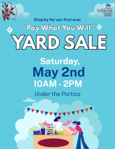Stop by our first-ever ‘pay what you will’ yard sale! The Milford Public Library is cleaning out our storage as we begin renovations. Everything must go! Join us under the portico and donate what you can for the items you select to take home.